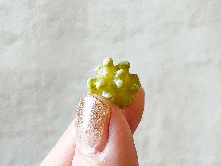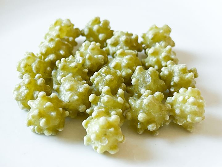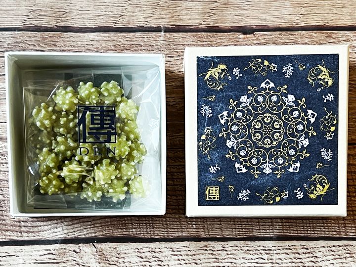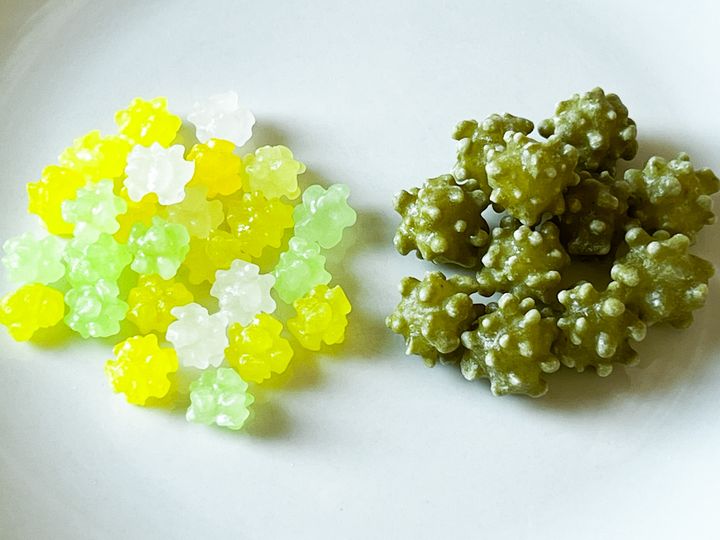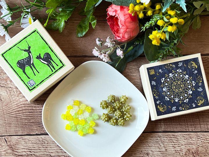 一方、「大和煎茶」は、一般的な金平糖のサイズよりも大きめの「こんふぇいと」が入っていました。奈良月ヶ瀬の大和茶の煎茶を使って作られたそう。ちょっと渋い緑色をしています。