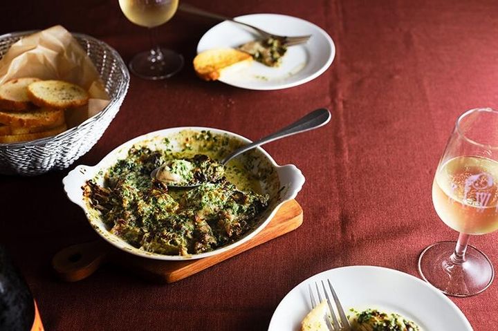 牡蠣の旨味とブルギニヨンクリームをたっぷりパンに塗って召し上がり。シャブリのような辛口白ワインやシャンパンもよく合う。酒と料理を愛しすぎる料理家、スヌ子こと稲葉ゆきえさんが提案する、グラタンつまみをご紹介します。
