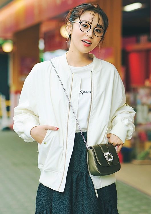 メガネ¥12,000/OWNDAYS MA-1ブルゾン¥25,000/PLST Tシャツ¥9,790/マイストラーダ スカート¥3,790/神戸レタス イヤリング¥9,900/エンジュ ジュエリー(フォーティーン ショールーム) バッグ¥6,490/カシュカシュ(アンビリオン)