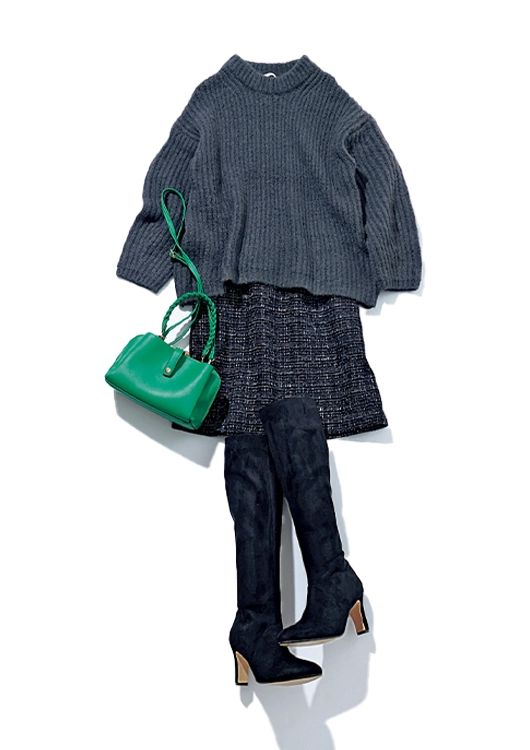 ショルダーバッグ¥6,930/カシュカシュ(アンビリオン) ニット¥2,990/GU ミニスカート¥10,890/WILLSELECTIONル ミネエスト新宿店 ロングブーツ¥30,800/ダイアナ(ダイアナ 銀座本店)