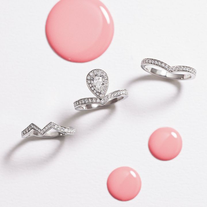 皇后ジョゼフィーヌが好んだペアシェイプ、V字のエグレットがメゾンの象徴。リング・右から「ジョゼフィーヌ」コレクション エグレット バンドーリング〈Pt×D〉¥539,000「ジョゼフィーヌ」コレクション エグレット パヴェ リング〈Pt×Dセンター0.5ct〜〉¥1,122,000〜「ジョゼフィーヌ」コレクション アムール デグレット バンドーリング〈Pt×D〉¥548,900(すべてショーメ)