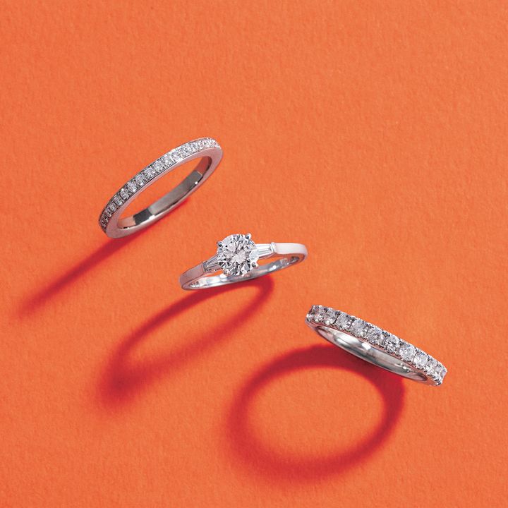 純白に輝くラウンドブリリアントカットダイヤモンドと、サイドに施したテーパードバゲットカット ダイヤモンド。伝統と革新が織りなす、モダンなコントラスト。リング上から・エタニティリング〈Pt×D〉¥570,000「ザ グラフ プロミス」〈Pt×Dセンター0.5ct〜〉¥1,000,000〜エタニティリング〈Pt×D〉¥980,500(すべてグラフ/グラフダイヤモンズジャパン)