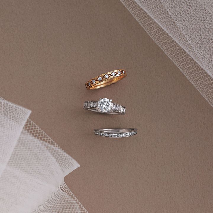 リング上から・キルティングモチーフが刻まれた、モダンなエタニティリング。「ココ クラッシュ」〈YG×D〉¥594,000ヴァンドーム広場を彷彿とさせる八角形のラインは、香水「シャネルN°5」のボトルストッパーにも使われている。連なるアームと、ラウンドカットダイヤモンドの美しい対比。「プルミエール プロメス」〈Pt×Dセンター0.25ct〜〉¥850,300〜リボンを結ぶように、ふたりの運命が交差する。「リュバン ドゥ シャネル」〈Pt×D〉¥699,600(すべてシャネル)