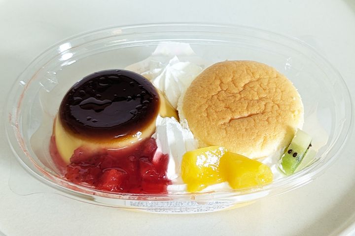 これまで、コンビニスイーツで何回かプリン・アラモードが販売されているのを見たり、実際に食べたりしましたが、ここまでサイズが大きいものはおそらく初ではないでしょうか? 測ってみると一般的なカップスイーツの直径が約6~7cmのなか、このスイーツの横幅は約15cm! さっそく紹介します。