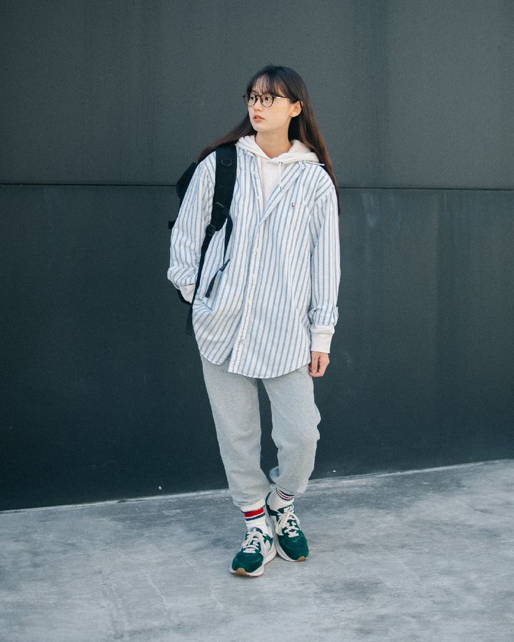 参照元:上下スウェットコーデ。シャツできちんと感をだして部屋着感を払拭