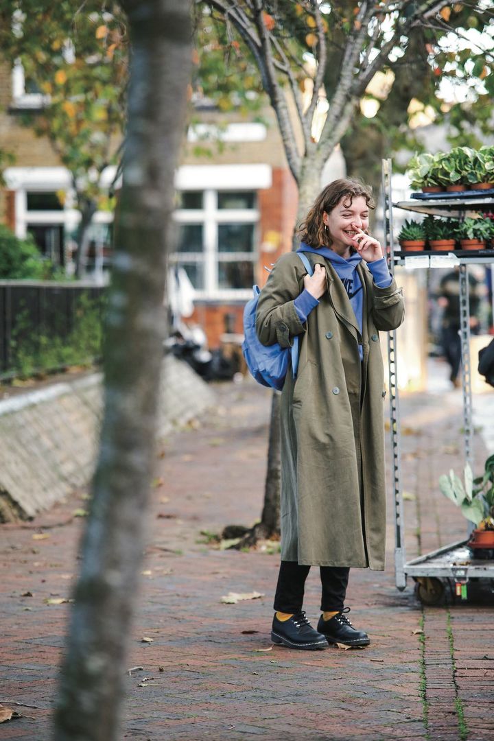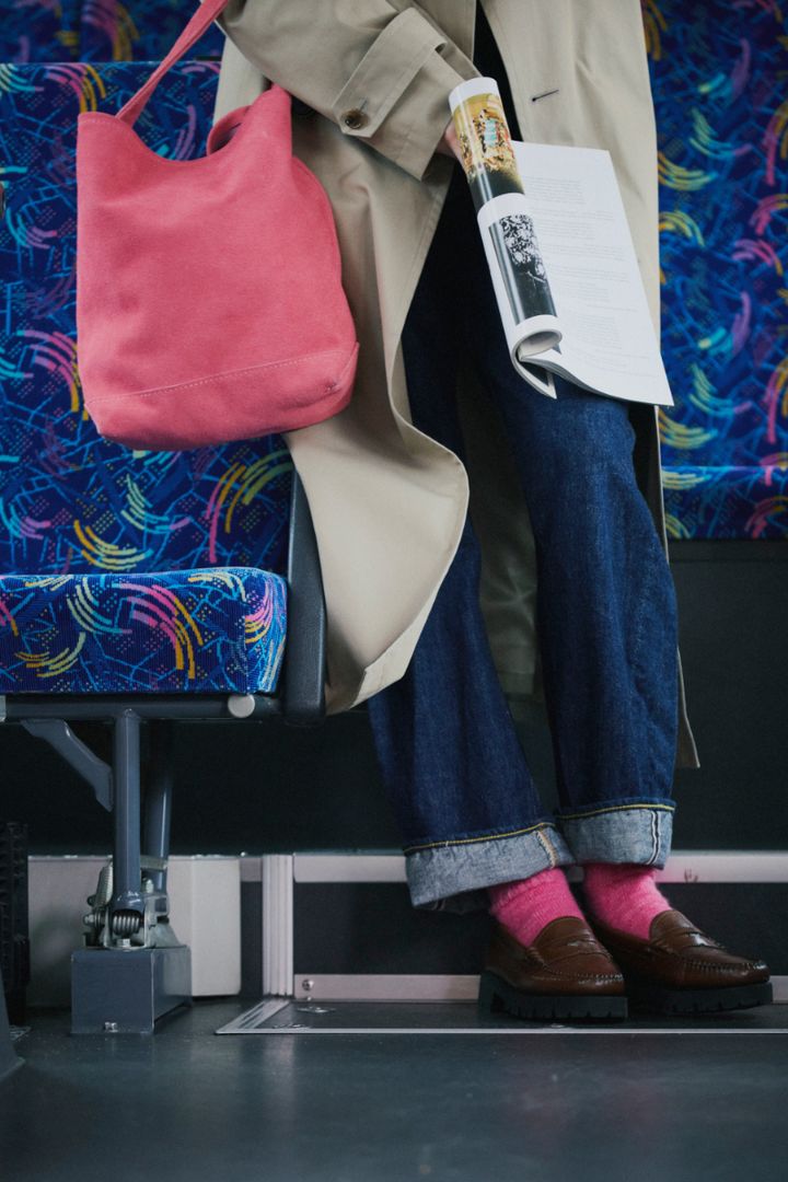 秋はデニムオンデニムにトレンチコートをさっと羽織るのがお気に入り。クールな雰囲気で着るのもいいけれど、今日はヴィヴィッドなピンクのバッグを持ってみた。ついでに靴下も! デニムやコートの無骨な表情に愛嬌が加わって、新鮮なスタイルが完成した。