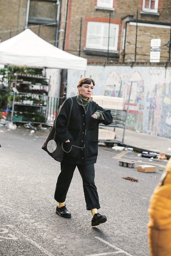 ブランドのアイコンモデル3ホールは、コーディネートを選ばない優等生。アウターとパンツともにブラックでまとめて端正に。ソックスで優しい色味を添えて装いにリズムを。