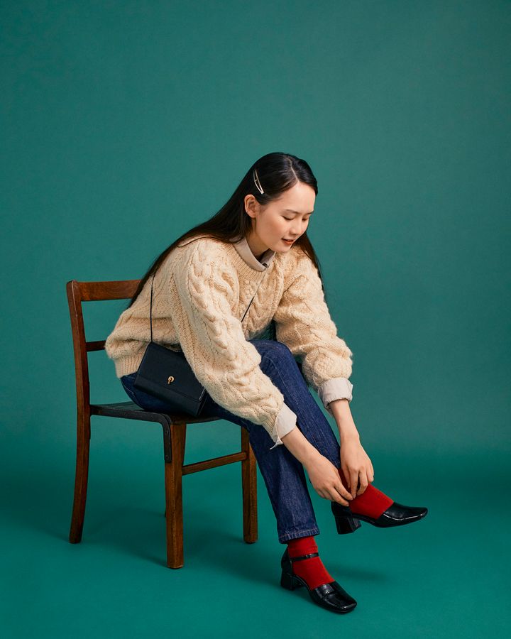 ニット×デニムのベーシックスタイル。ショルダーバッグやパンプス、赤のソックスを合わせてレディなスタイルに仕上げると、たちまちパリジェンヌ感に包まれます。袖をまくる時はレイヤードしたシャツを見せると抜け感がでて◎。
