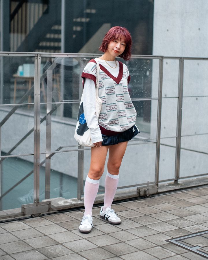 ニットベストを主役に、シアーなハイソックスにスニーカーを合わせたmix感がポイント!