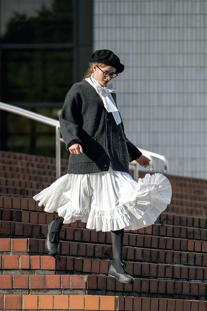 スカートの愛らしさを振り撒きながら、1段飛ばしで階段を駆け下りる。足元は大丈夫?「 Its ’ OK! 」なんてったって今日はスニーカーだから。ギャザーとフリルがたっぷりのガーリーなスカートは、足元にスパイスを仕込むことで、甘さとラフさのバランスがとれていい感じ。《ムーンスター》の耐水モデルで、急いで急いで。