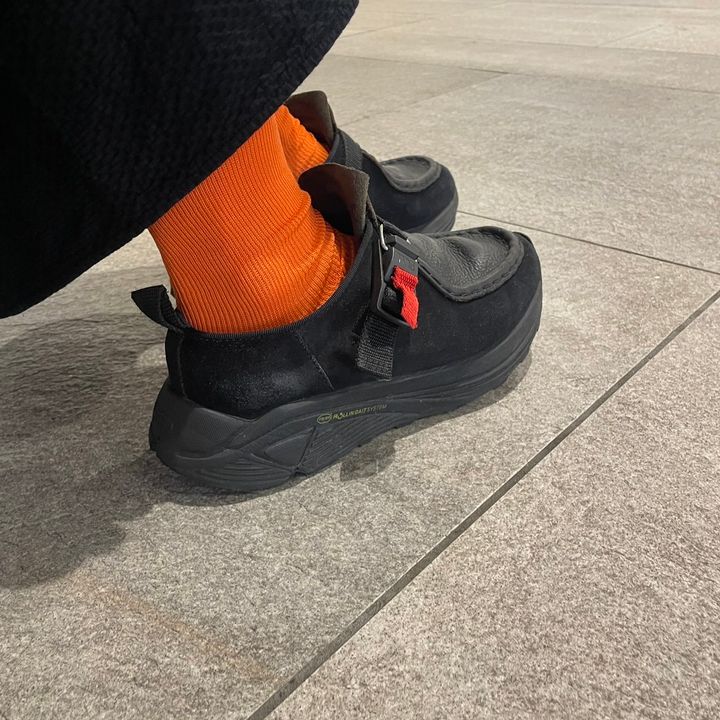 オールブラックの装いにヴィヴィットなオレンジを加えることで遊び心とメリハリが生まれる。取り入れるのは難易度が高いように感じる鮮やかなカラーは、靴下で取り入れるのがおすすめ。