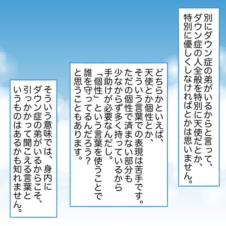 ダウン症は、比較的穏やかで平和主義で、天使のように感じられる特性も多く備わっているとよく言われているし、そう見受けられる部分はあります。ダウン症に関わらず、近年、特に「個性」というオブラートをさまざまなシーンで使われるように感じる場面があります。それ自体が悪いわけではありませんが、ダウン症を持つ弟と実際に生活を共にしてみると、「個性」や「天使」の一言だけでは片づけられないことが少なからずあります。