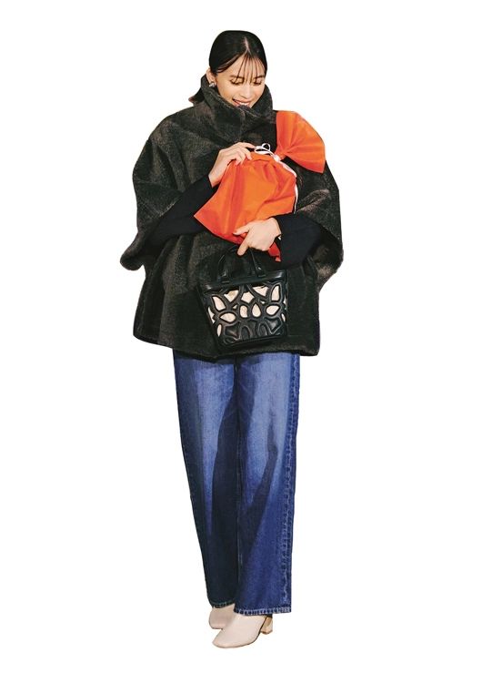 エコファーケープ¥20,900/ココ ディール、ニットセットアップ ニット¥9,990/PLST、デニムパンツ¥8,910/ギャレスト(ワールド)、カットワークバッグ¥5,990/ZARA(ザラ)、ショートブーツ¥3,990/GU、ストーンイヤリング¥2,310/mimi33(サンポークリエイト)