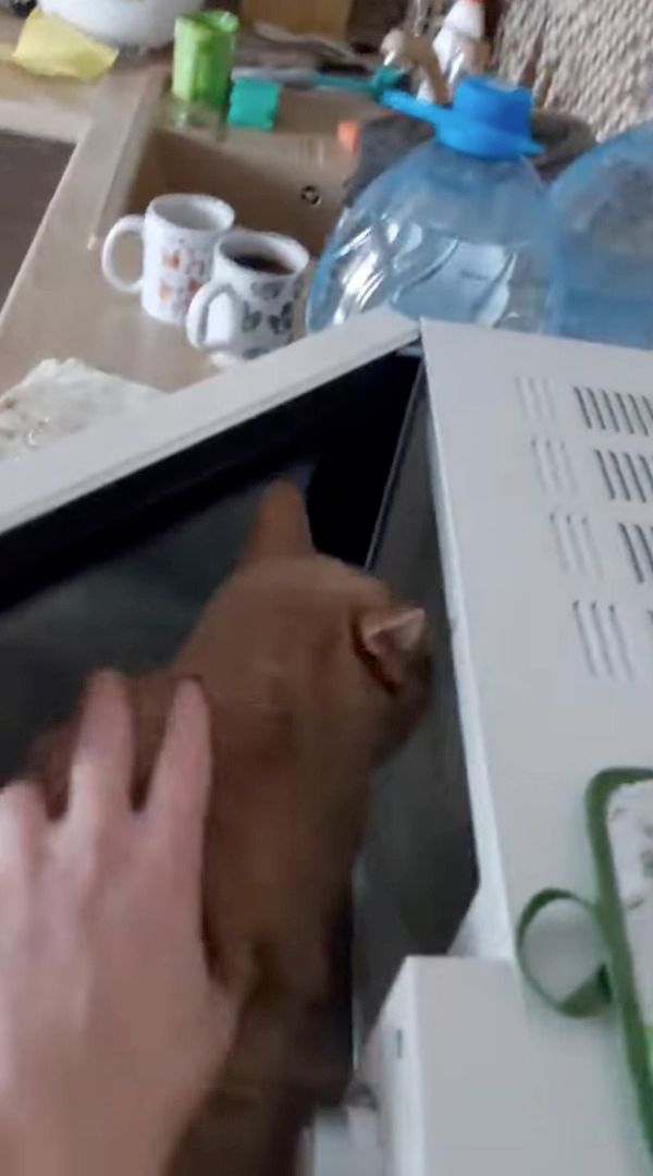 それでも、ルイは電子レンジの中が気になるようでした。 そこで、飼い主さんはルイの体に手を伸ばすのでした。