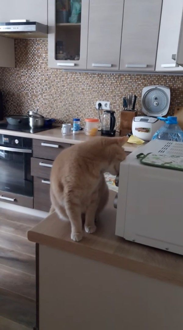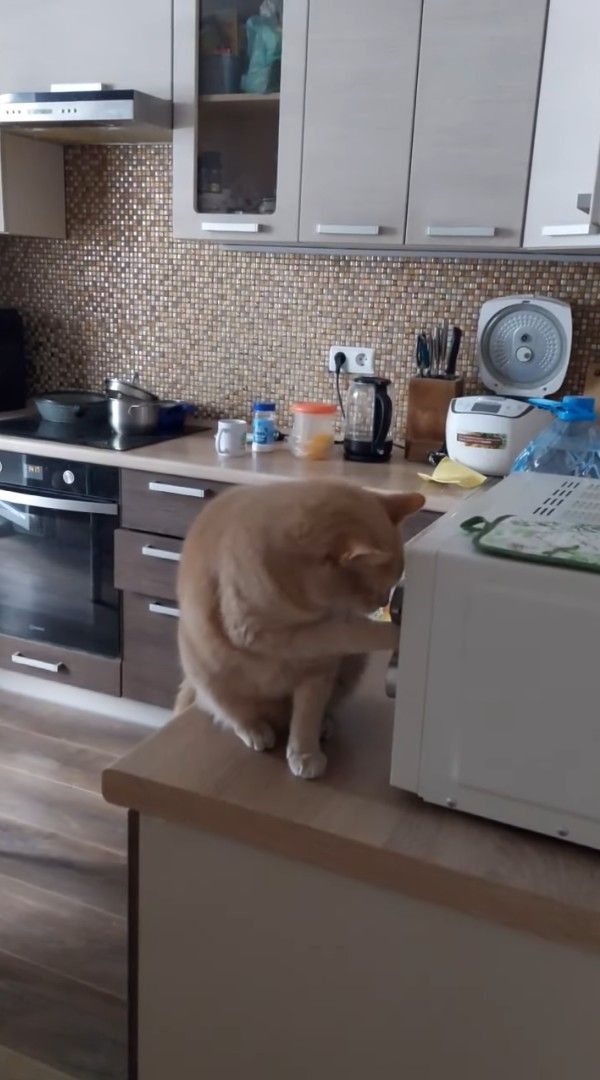 キッチンでイタズラをしていた猫。 手先が器用なようで、この子は電子レンジを開けたりしようとしていましたよ!!