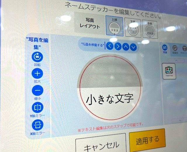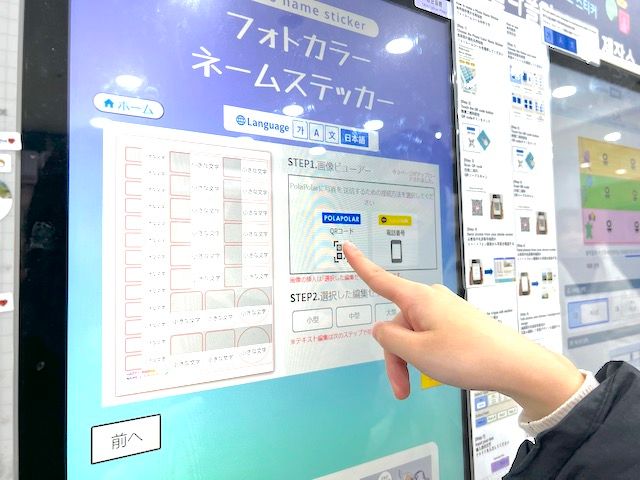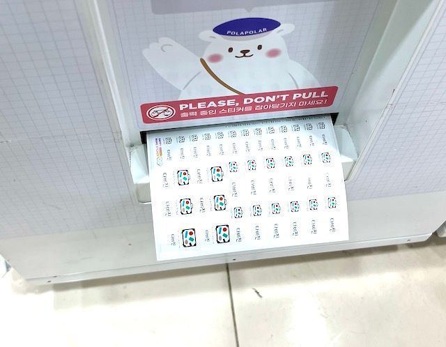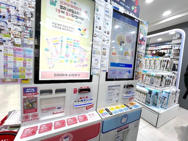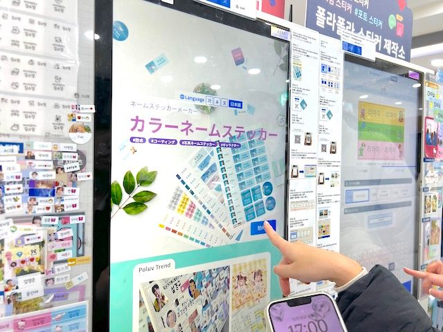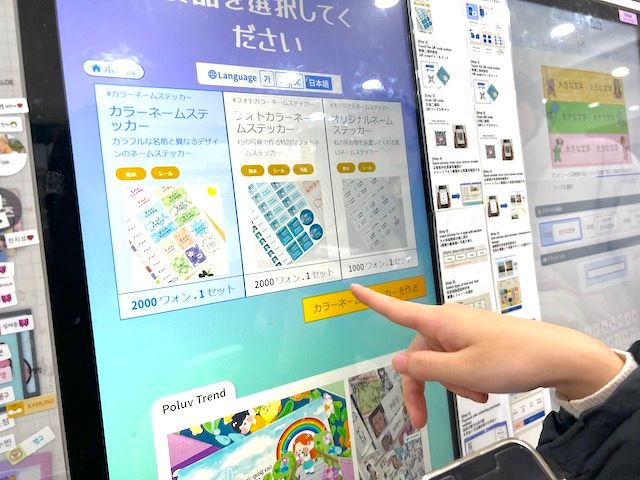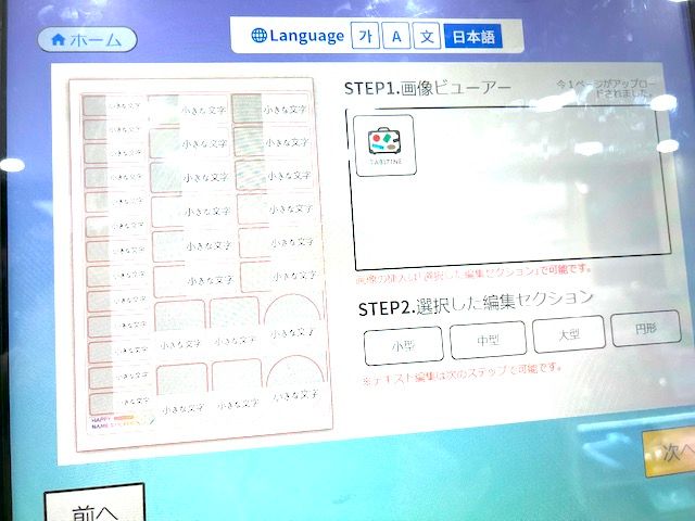 今回の目当ては自分で作れる写真入りのネームシール! 3階の文具・デジタル・包装のコーナーにて発見しました。金曜の夜だったこともあってか、常に人が3〜5人並んでいて、日本人もちらほら。外国人や地元の人も並んでいました。機械は2台並んでいてピンクの方は小さいシール、ブルーの方は大きめのシールが作れるようです。筆者が選んだのはピンクの小さなシールを作る方。