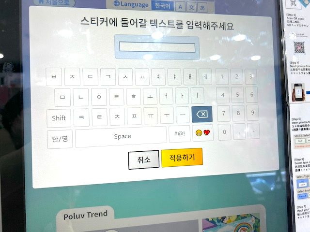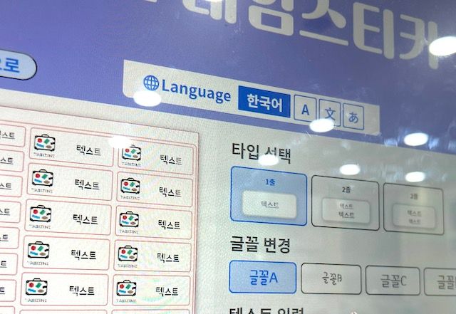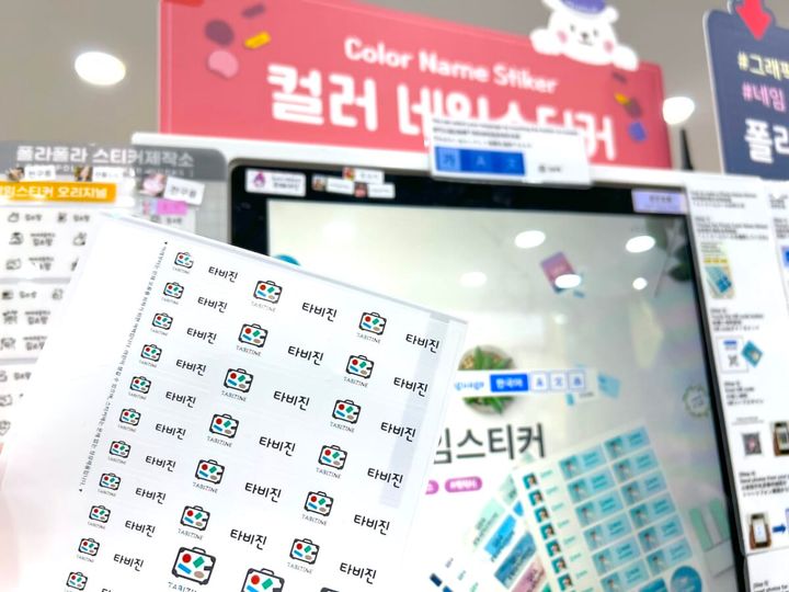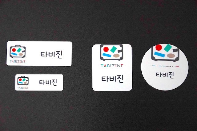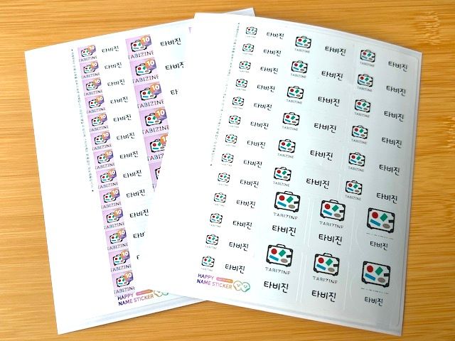 1枚につき4種類のシールができあがりました。サイトのロゴと「TABIZINE」をハングルでプリント。ロゴの画像をうまく中に入れることができなかったのが残念…。色々な大きさの画像を準備したり編集したりすればもう少し上手にできたかも。自分の写真や名前はもちろん、推しの写真や名前をプリントすれば世界で一つの推し活グッズに! 友だちの写真で作れば喜ばれるお土産にもなりますよ。