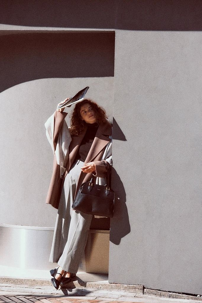 日中も10℃前後の乾燥した冬晴れ。ひなたと日陰でもかなり温度差がある場合もあるので、簡単に温度調節が効く「コートの上にストールをはおる」スタイリングをマスターしておくと、重宝しそう。