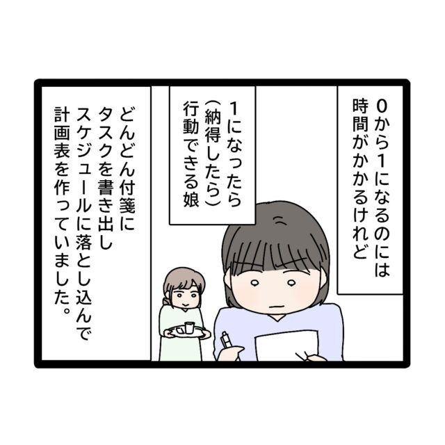 「0から1になるのには時間がかかるけれども、1になったら(納得したら)行動できる」娘ですので、どんどん付箋にタスクを書き出し、スケジュールに落とし込んで、計画表を作ってしまいました。