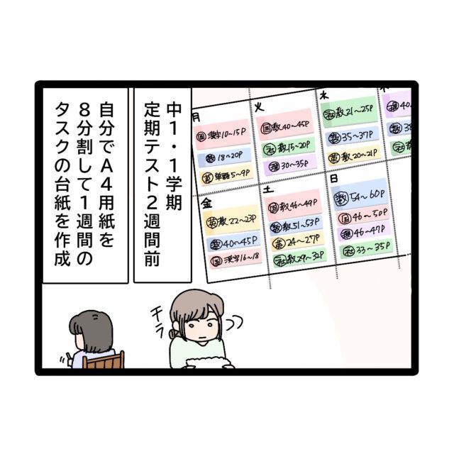 テスト勉強の計画の立て方も見てきていますから、私が何も言わなくても、中学最初の定期テスト2週間前には、A4用紙を8分割して1週間のタスクの台紙を作っていました(笑)。