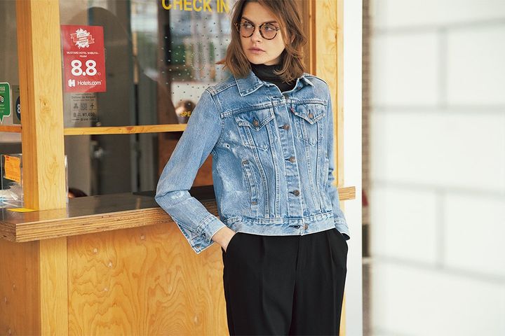 黒タートルと眼鏡の緊張感をあせたデニムで緩和。きゃしゃな眼鏡ならあどけなさが残り、デニムとのバランスも良好。
