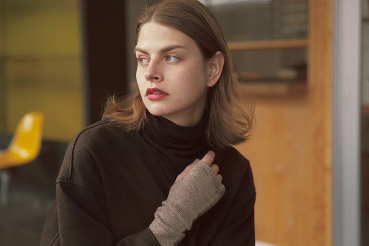 ゆったりと重ねたプルオーバーを引き締める「小さなニット」。適度にタイトなニットグローブをそでからのぞかせるだけでバランスUP。