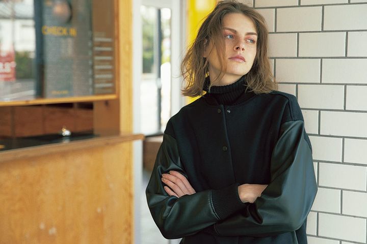 男の子みたいなブルゾンとピンクメイクの意外性。メンズライクな切り替えブルゾンを重ねたミニマルなレイヤードには、目元にピンクを効かせた「服以外」のギャップを。色みがガーリーなぶん、アイシャドウはアバウトに、「塗り方はカジュアル」がポイント。