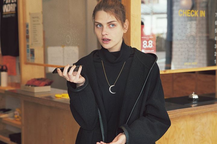 溶け込ませるように黒を重ね、大きなモチーフネックレスを光らせる。タートルになじむ黒ガウンをON。ALLブラックに徹することで、スワロフスキーが輝く華やかなムーンネックレスがいっそう引き立つ。