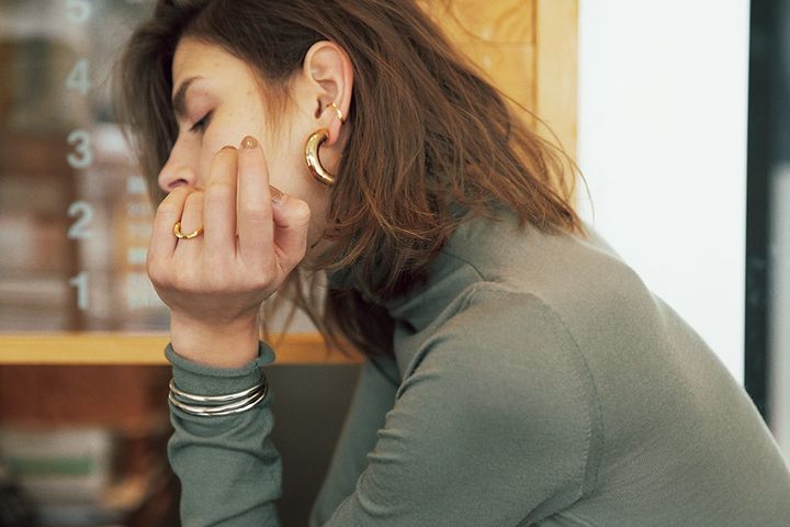 耳元のアクセサリーにも「違い」を。デコラティブで太めなイヤリング、細く耳になじむ小さなイヤカフ。同じ色・形でそろえて統一性をもたせるのがポイント。