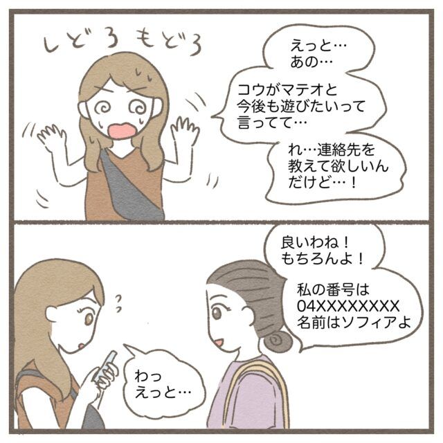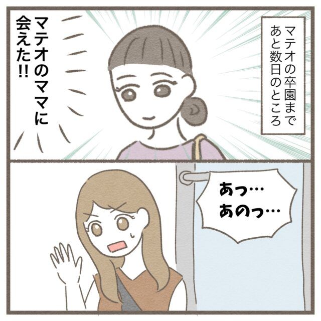 1月で卒園してしまうマテオくんの連絡先を何とか知りたいみゅこさん、なかなか会えず、本格的に手紙を送る作戦を決行しようと思っていたある日・・マテオくんのママに会うことができたのですが・・