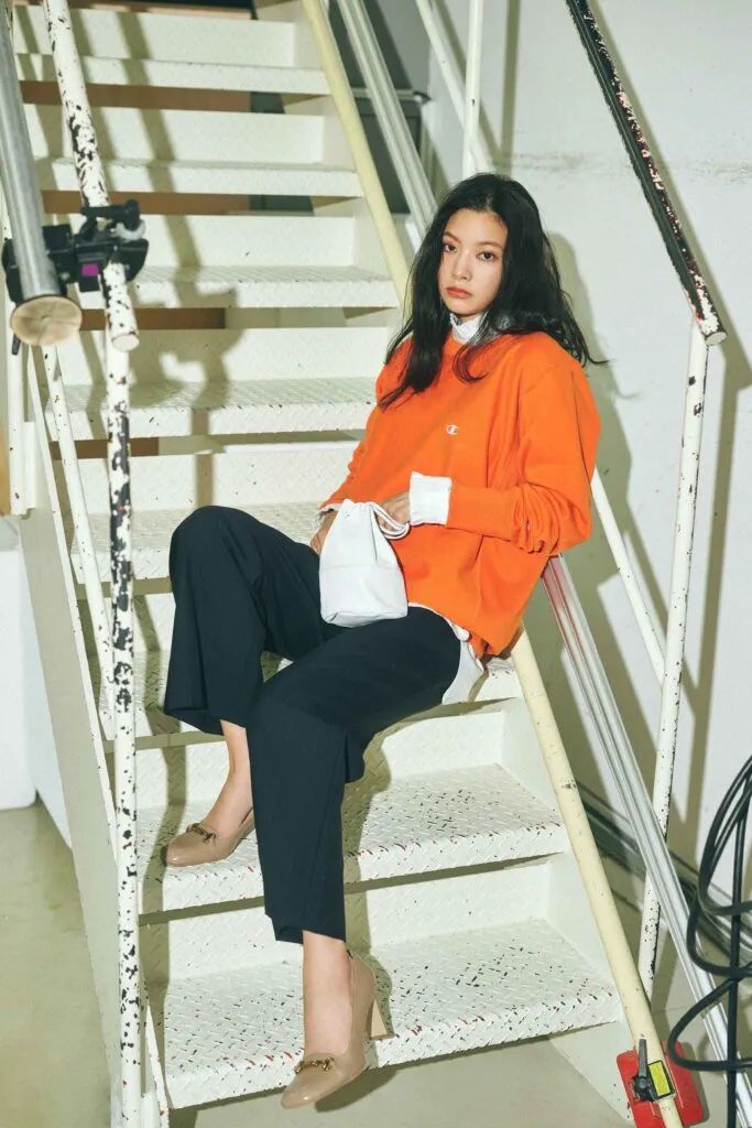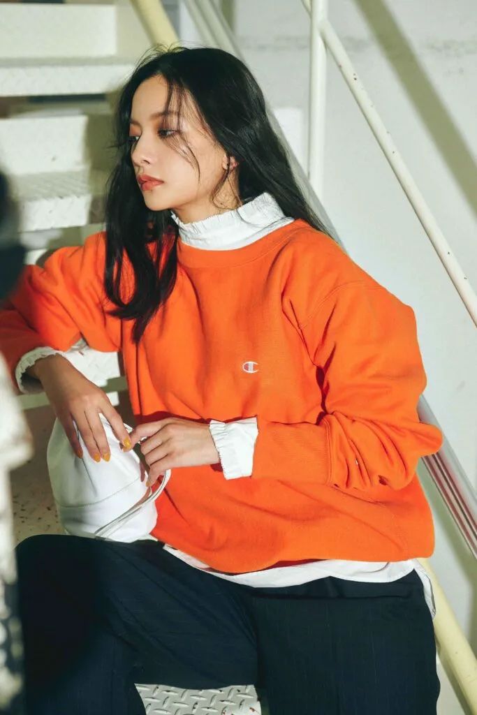 派手色スウェットに、お団子やポニーテールなどのアップヘアでは元気な印象になりすぎてしまうので、ニュアンスのあるダウンスタイルで大人っぽく。フェミニンさをちりばめて女性らしいムードに仕上げるのがおすすめです。