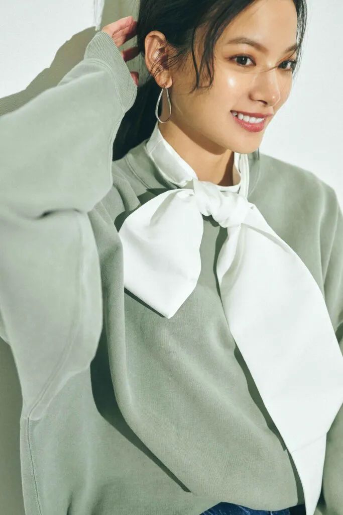 ボリュームのあるリボンブラウスを重ねてもかしこまりすぎない抜け感が出るのは、スウェット素材だからこそ。大ぶりのピアスを合わせて横顔もおしゃれに。シャツ、シアータートル…と合わせるインナーを替えて様々な表情を楽しんで。
