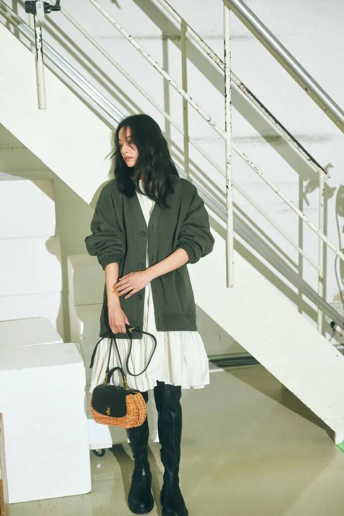 オーバーシルエットのカーデで、甘めのワンピコーデを旬のカジュアルに昇華。冬にも似合うカゴバッグを合わせて軽快さを狙いたい。