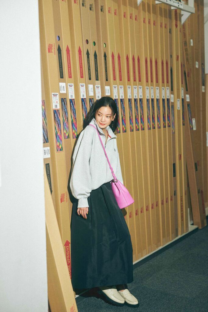 スウェット¥12,980(チャンピオン/ヘインズブランズ ジャパン カスタマーセンター)スカート¥22,000(アンタイトル)バッグ¥25,300(ヴィオラドーロ/ピーチ)ブーツ¥39,600(ダイアナ/ダイアナ 銀座本店)イヤリング¥12,100(マージョリー・ベア/ココシュニック新宿タカシマヤ店)時計¥22,990(クルース/HIROBルミネ新宿店)ブレスレット¥9,350(ココシュニック オンキッチュ/ココシュニック)
