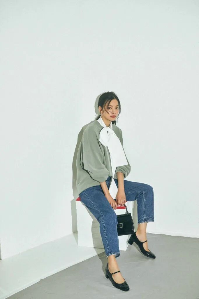 シンプルなクルーネックのスウェットにリボンブラウスを重ねたら、今っぽさと大人の可愛げを両立した着こなしに。さらに足元にメリージェーンを合わせることで、コーデ全体がグッドガールな印象に仕上がります。ライトグリーン×ブルーデニムの爽やか配色だから、冬から春までマッチしそう。