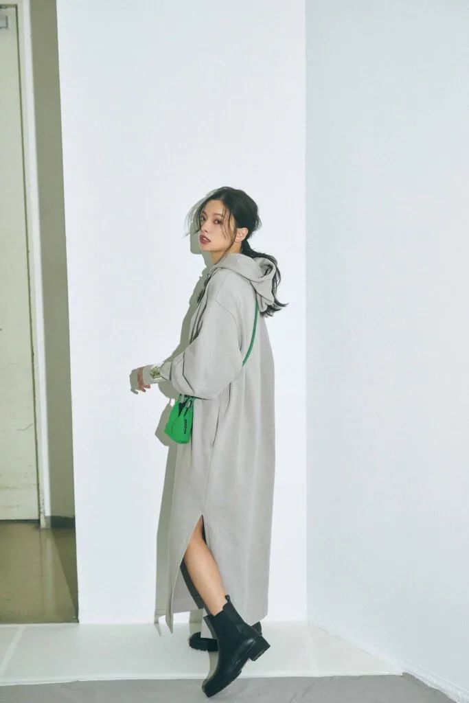 レイヤードやコーディネートで盛るのが難しいフーディワンピは小物で辛口に振るのが、洒落見えの近道。鮮やかなグリーンのミニショルダーで、のっぺり感を払拭し、モード感を盛り上げて。大ぶりのブレスレットを重ねてさらにモードっぽさを加速させたい。