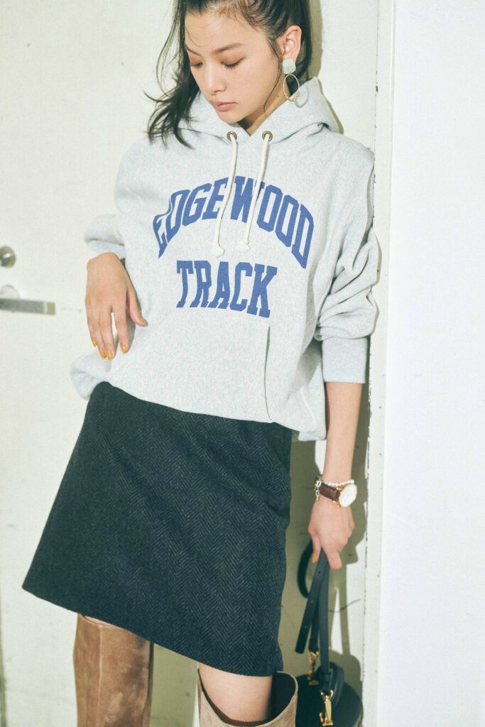 大人っぽく穿ける台形ミニに、リラクシーなゆとりのあるロゴフーディが好バランス。カジュアルながら、彼とのデートはもちろん、女友達との年末イベントでも即戦力として活躍してくれそう。