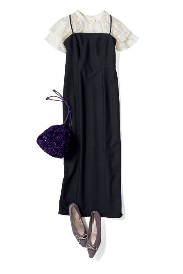 ブラウス×キャミワンピセット¥28,600/アプワイザー・リッシェ パールハンドバッグ¥70,400/ヴァニーナ/ルル・ウィルビー(アルアバイル) ラメパンプス¥18,700/銀座かねまつ(銀座かねまつ6丁目本店)
