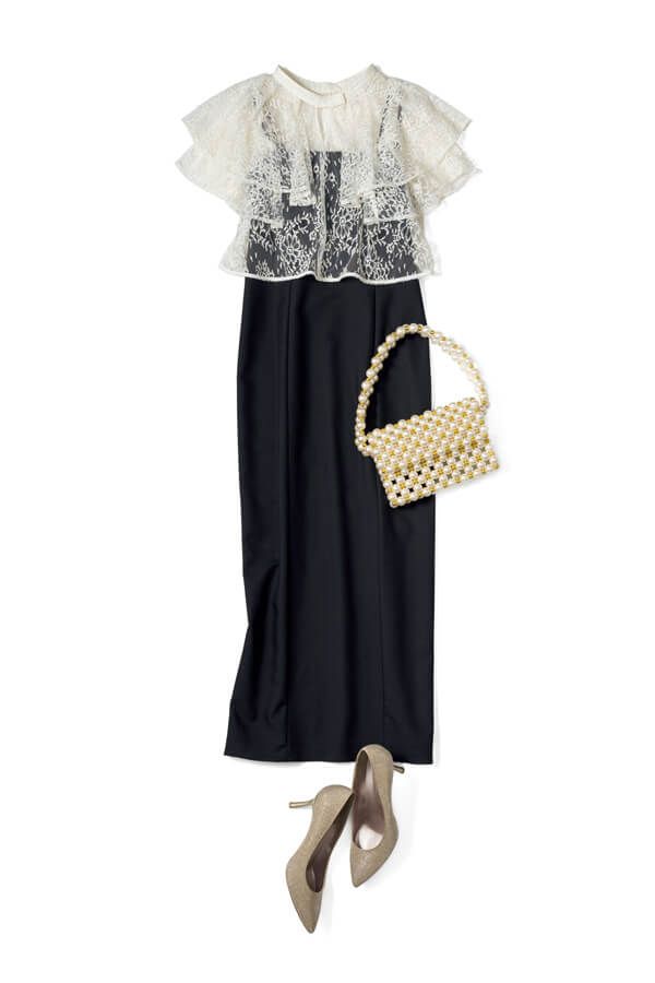 総レースが上品シックなブラウスでドレッシーに。大ぶりなフリル袖で、気になる二の腕もしっかりカバー! パールバッグ&ラメパンプスで、小物使いも高級感を意識して。
