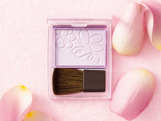 高輝度パールをたっぷり配合し、面で発光したような血色感あるツヤが特徴。パープルの偏光パールではかなげな透明感をプラス。