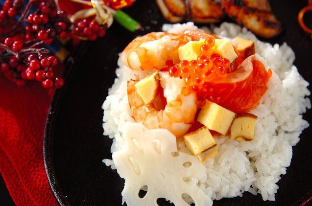 定番のおせちを取り入れて、まとめてちらし寿司にしました。華やかな盛り付けでお正月にぴったり!レンコンは皮をむいて花形に切りましょう。エビやサーモン以外にも、余った食材があればちらし寿司にしてみてください。