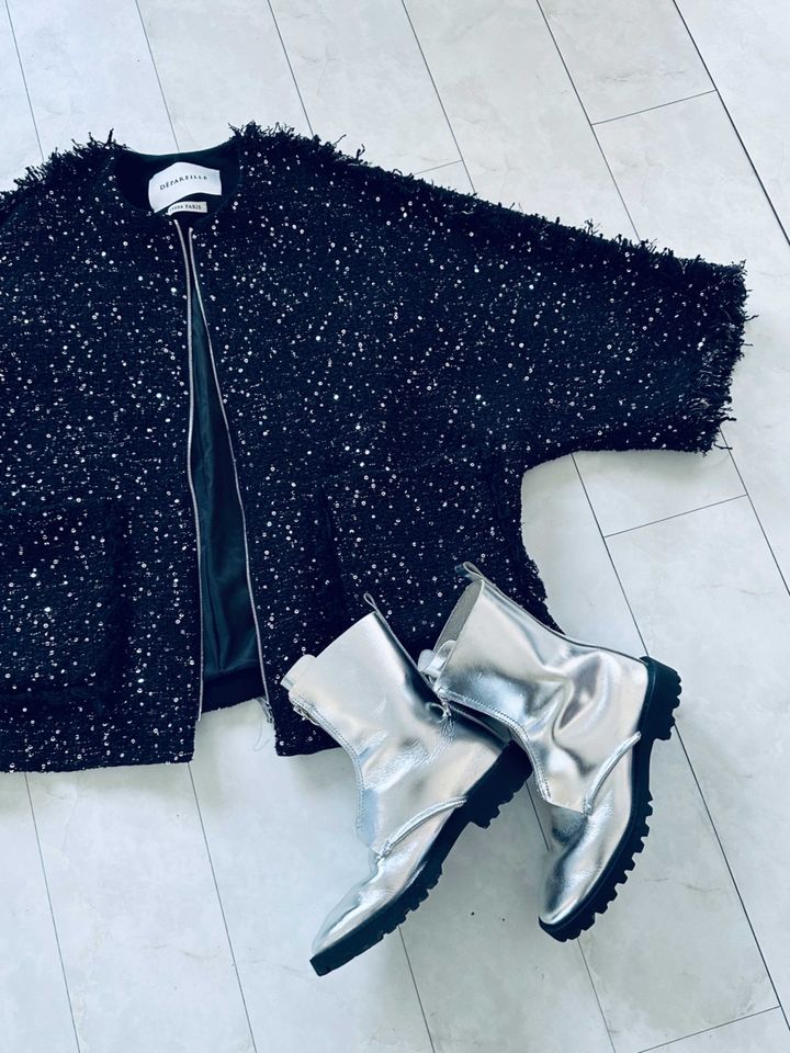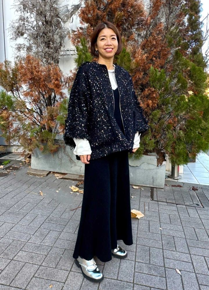 「今シーズン一番のお気に入りのスパンコールのツイードジャケットをメインにスタイリング。全体をモノトーンでシックにまとめながらも、ホリデーシーズンらしく足元にもメタリックレザーをプラスし、さらに華やかに。キラキラとしたこの時季をファッションでも楽しみたいです」