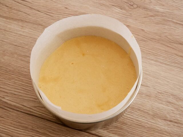 ⑥ 型に流し入れ、型ごと10cm程度の高さから2回ほど落とし、170度のオーブンで25分焼く
