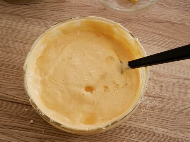 ⑤ 若干粉っぽさが残る程度まで混ぜたらサラダ油を加え、ツヤが出るまでさっくり混ぜる。