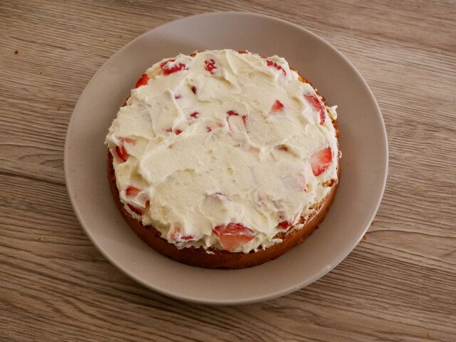 ④ スポンジ1枚の片面にクリームを塗り、角切りのいちごを散りばめ、もう1枚のスポンジを重ねる。