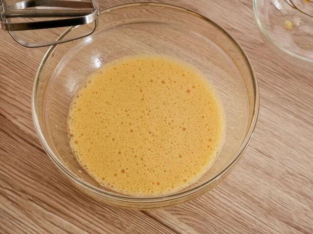 ② 砂糖を加えたら湯せんにかけ、ハンドミキサーの高速で泡立てる。(3分)