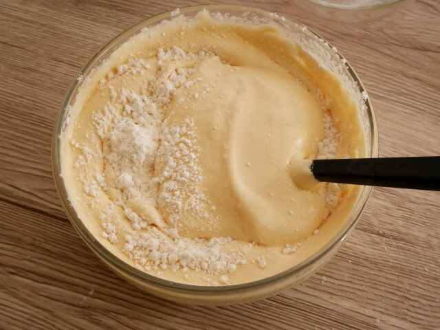 ④ ホットケーキミックスを生地の表面にふりかけるようにして加え、ヘラでさっくりと混ぜる。