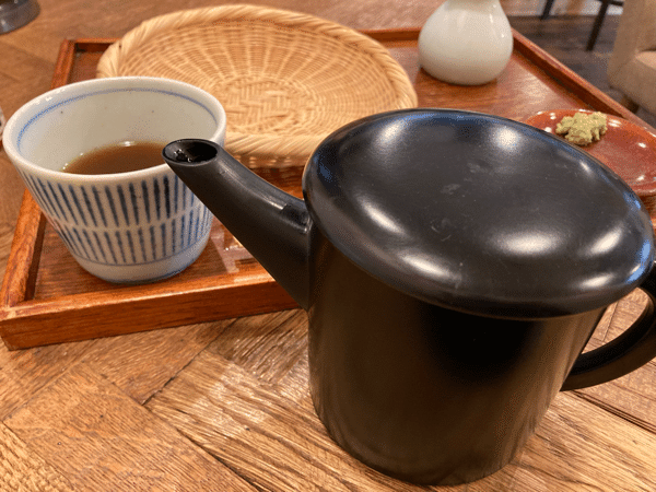 そばを楽しんだ後は、そば湯です!おそばを茹でたゆで汁のことですね。つけ汁に入れていただきました。ゆで汁もしっかりそばの味。また、おでんの横に設置されているポットには、温かいそば茶が入っていました。セルフでいただきます。