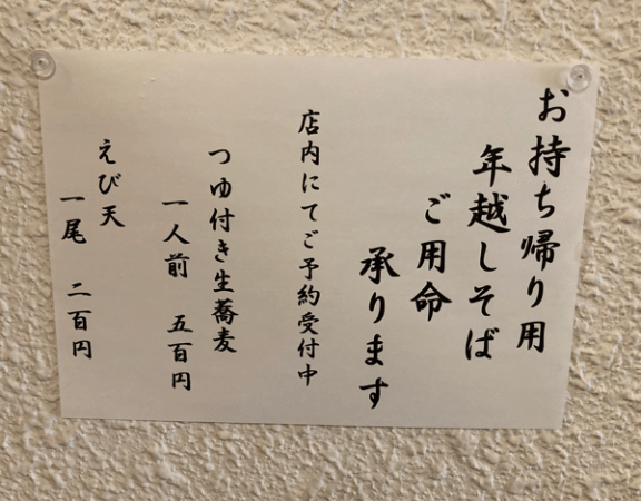 店内で年越しそばの予約を受け付けています。生そば1人前500円。つゆは、つけ汁とかけ汁から選択できます。えび天は1尾200円。しっかり予約して帰ってきました。