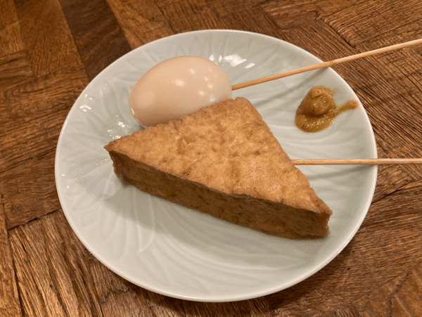 玉子と厚揚げをチョイス。私の大好きな大根は残念ながら売り切れでした。想像以上に厚揚げが大きくおなかにズッシリきました。あっさりしたお出汁の味で、からし味噌がよく合います。これからの季節は寒くなるので、おでんがより美味しく感じますよね。